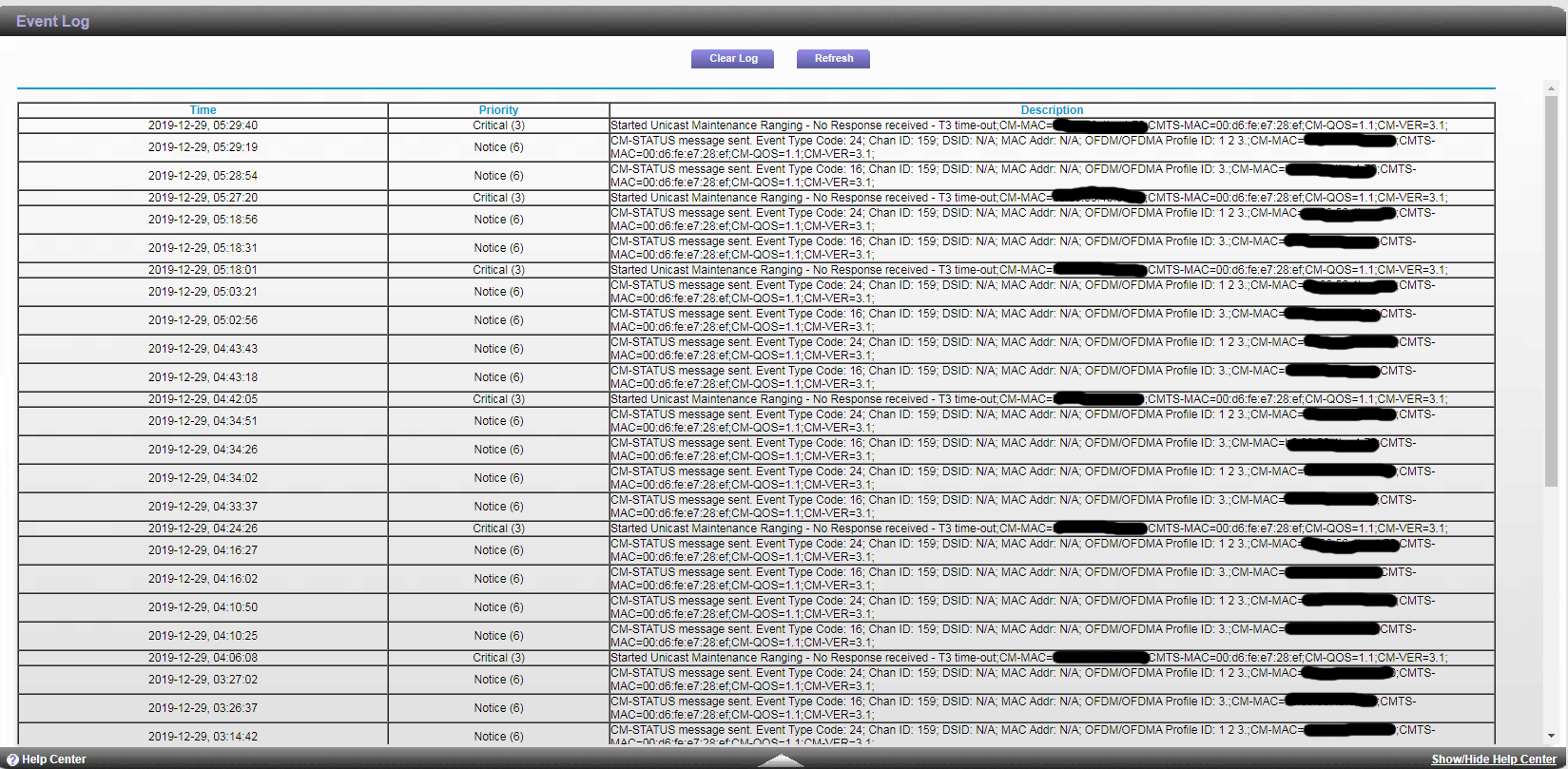A screenshot from the CM1000 modem log on
